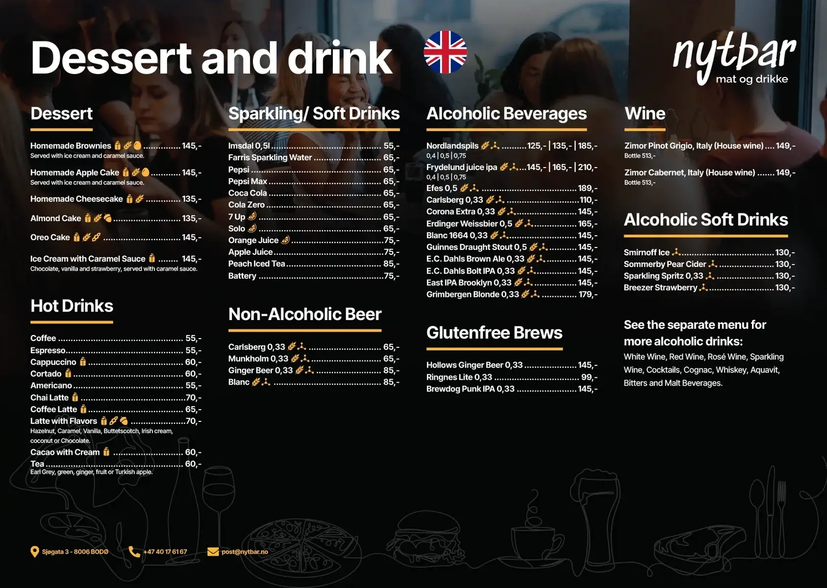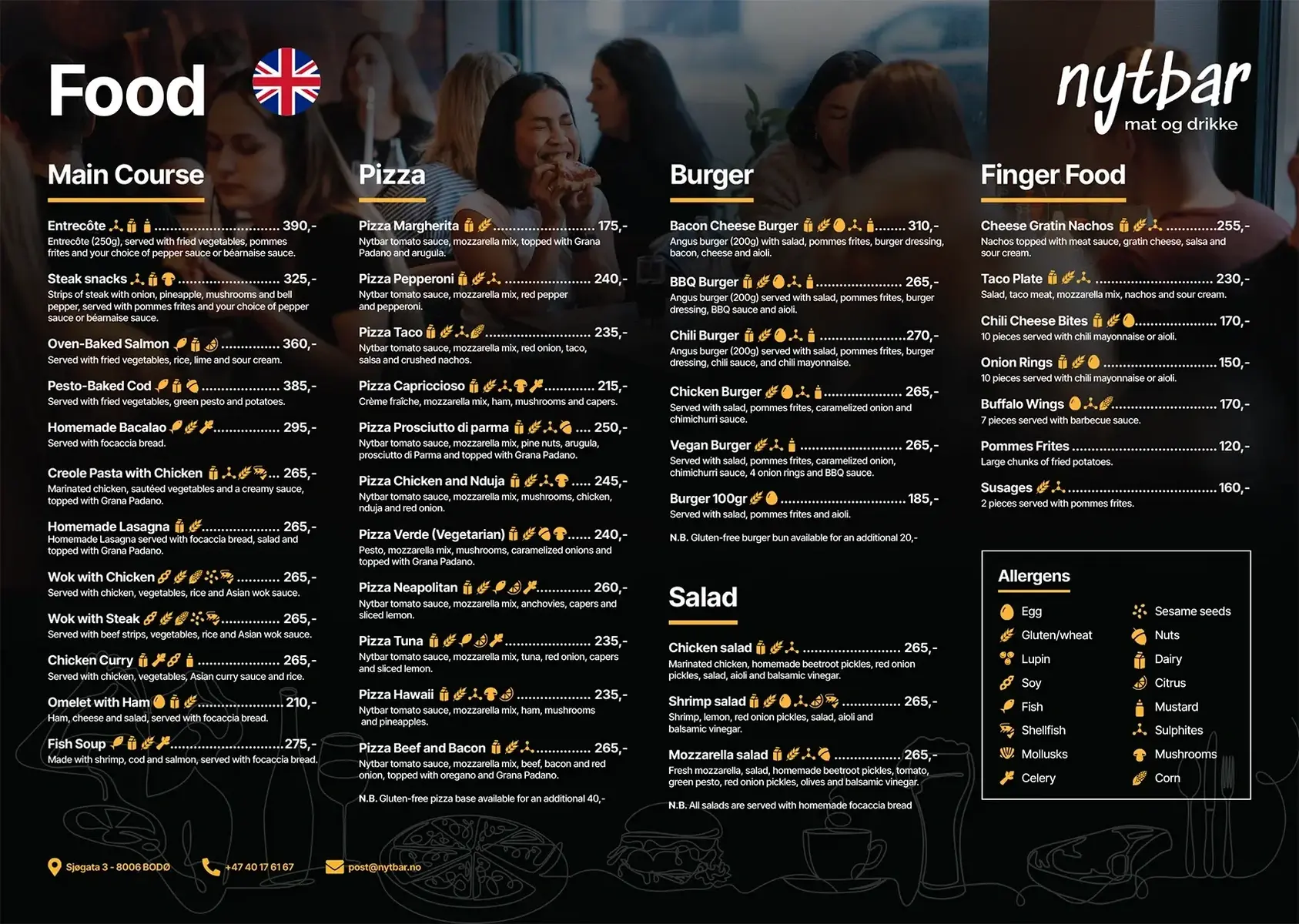 Vår meny er nøye utformet for å tilby et variert utvalg av smaker, slik at alle kan finne noe de liker. Enten du ønsker å prøve noe nytt eller foretrekker en av dine kjente favoritter, vil du finne et rikt utvalg av både mat og drikke.